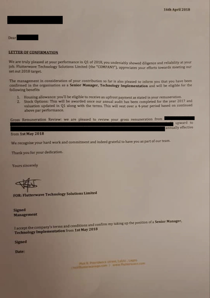 GB somehow convinced Jennifer to take the plunge into a 16 month-old fintech startup. Apparently, GB is blessed with the gift of persuasion, which becomes a recurring theme in the course of this story. Key to Jennifer’s decision to turn down an already-accepted, cushy job offer at one of Nigeria’s largest banks was the once-in-a-lifetime opportunity to join an early stage high growth startup and take advantage of its stock compensation plan. Over and above simply earning a salary, such shares in a sufficiently valuable startup can be financially life-changing. Flutterwave was not coy about it either. The offer was printed in her employment letter, and then in her confirmation letter 7 months later.